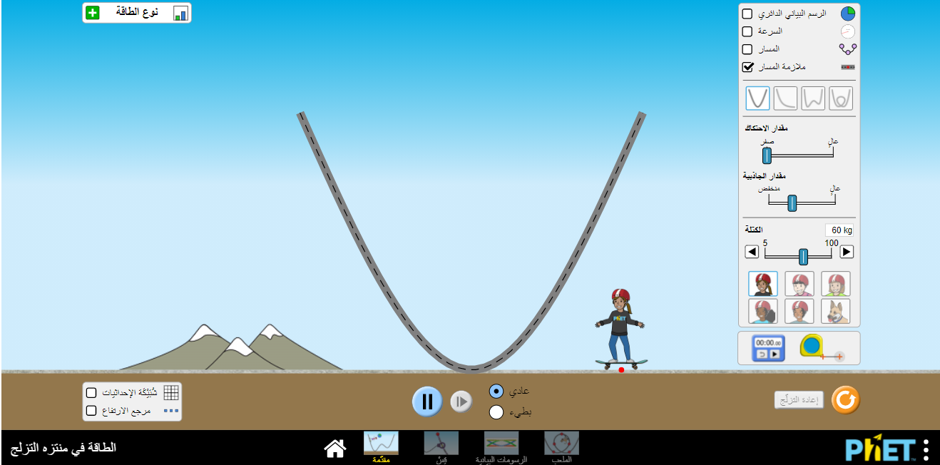 المسار ولاحظ الطاقة الكامنة" طاقة الوضع"، "طاقة الحركة".