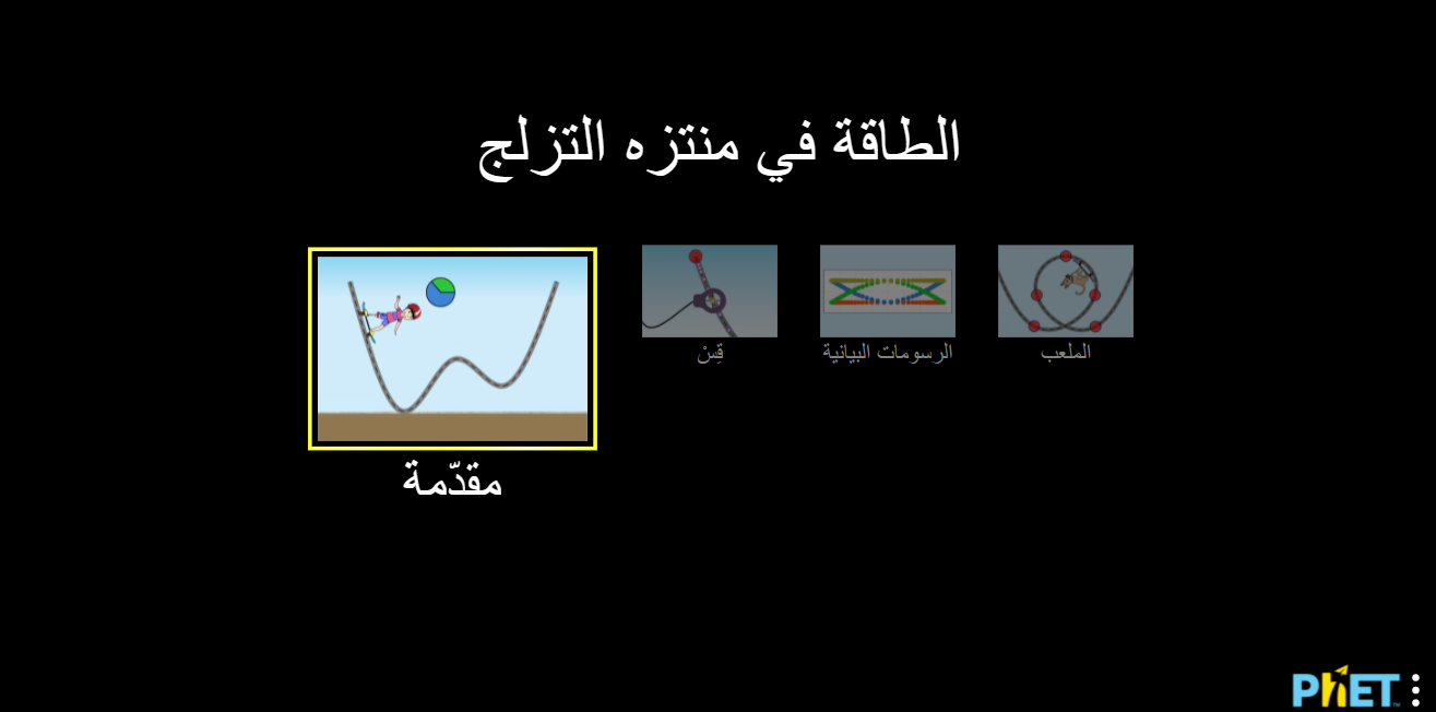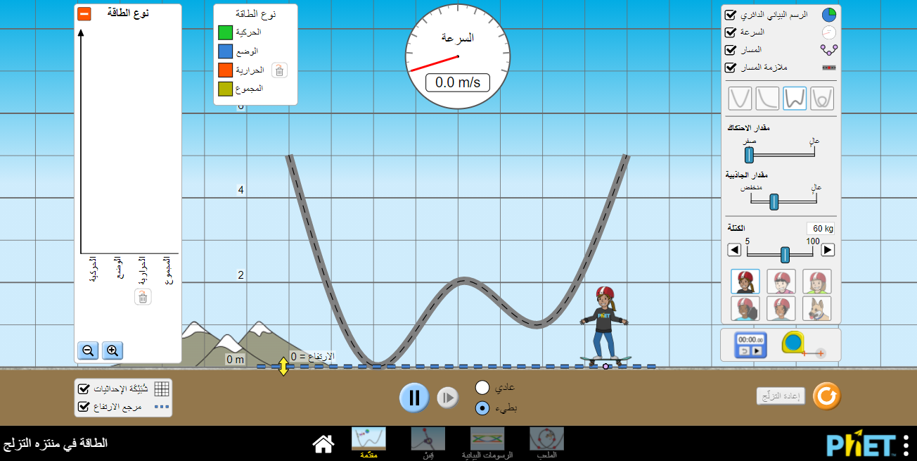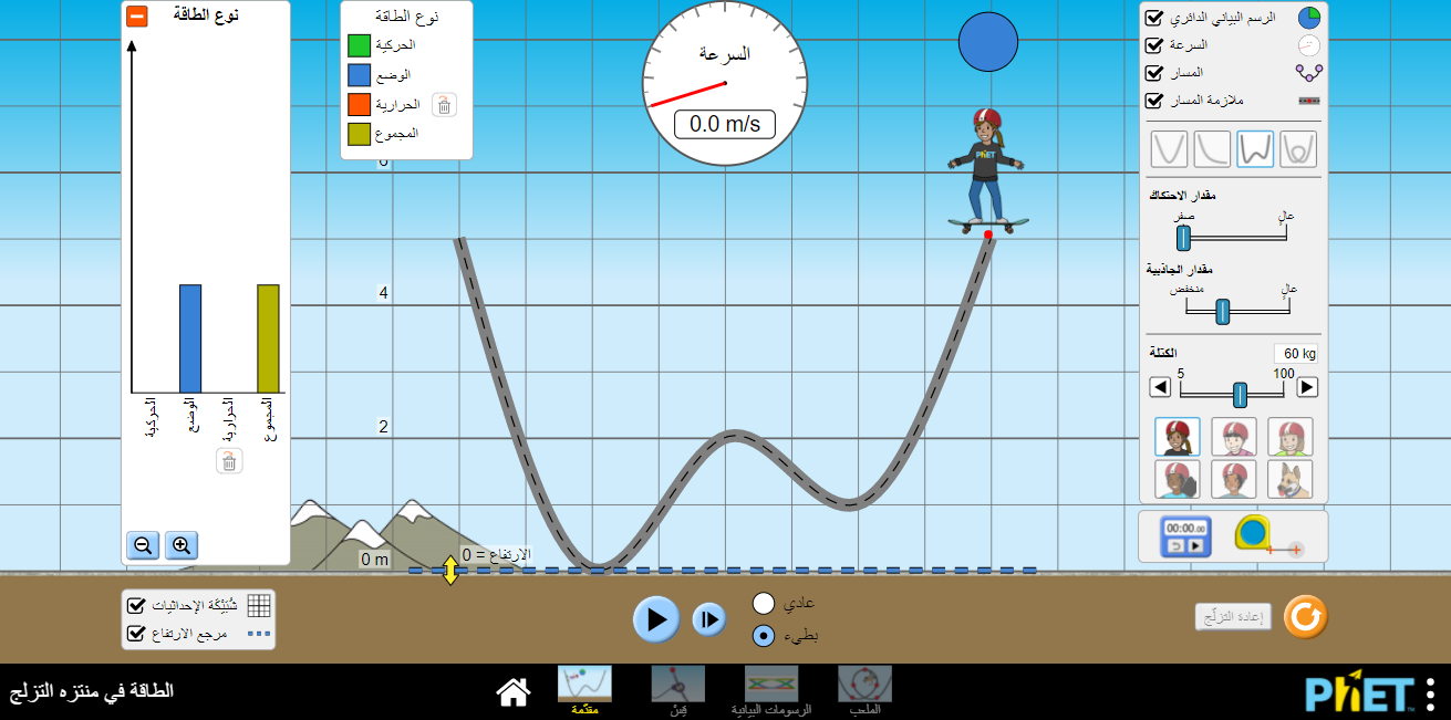 المسار ولاحظ الطاقة الكامنة" طاقة الوضع"، "طاقة الحركة".