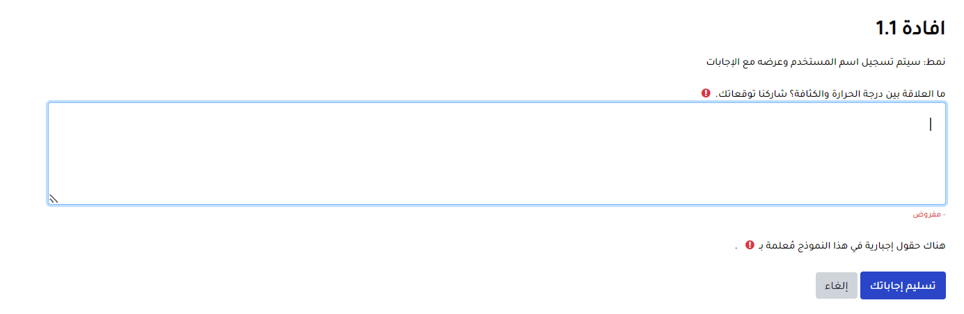 ابدا بقراءة الفقرات المطروحة بالافادة وشارك رأيك/ اجابتك/ توقعك/ .. من خلال كتابتها مباشرة في المكان المخصص لها ( انظر الصورة الآتية). وبعد الانتهاء تأكد من تسليم اجابتك عبر النقر على أيقونة "تسليم اجابتك"