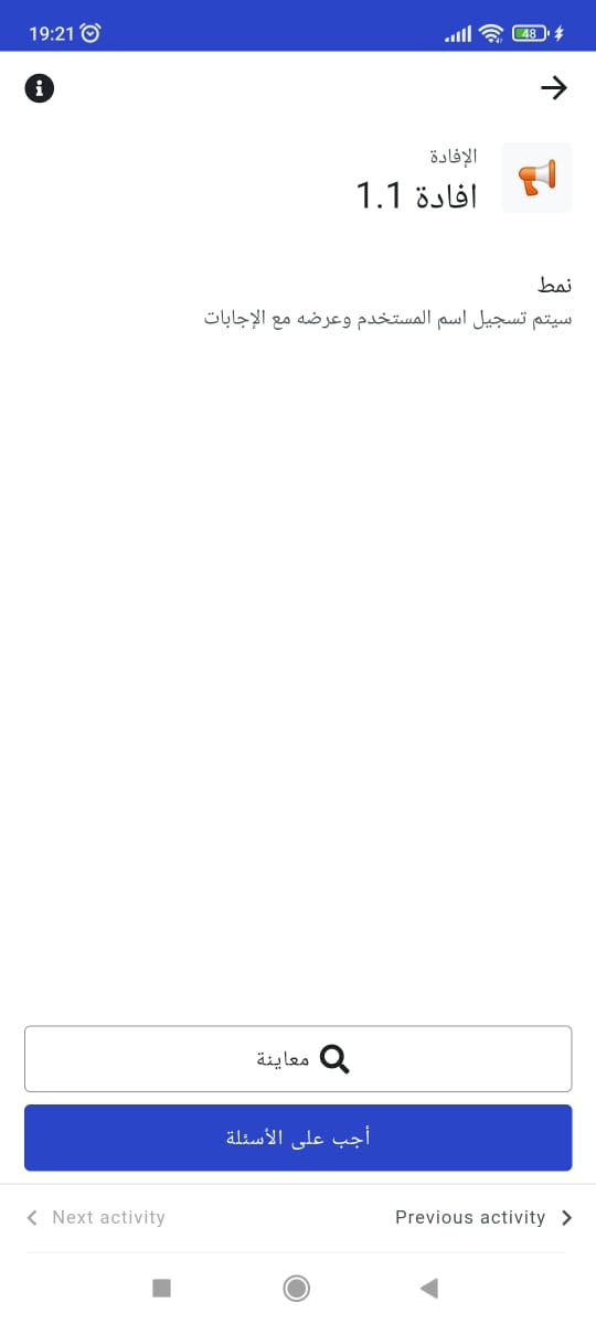 تنويه!في بعض الأحيان تكون الإفادة "غير مشخصنة" أي أن اسمك لا يظهر على المداخلة التي تقوم بها لكن النظام يحفظ مشاركتك وانجازك. ونوع آخر من الافادات "المشخصنة" والتي يظهر اسمك عليها عند عرض الإجابات. |